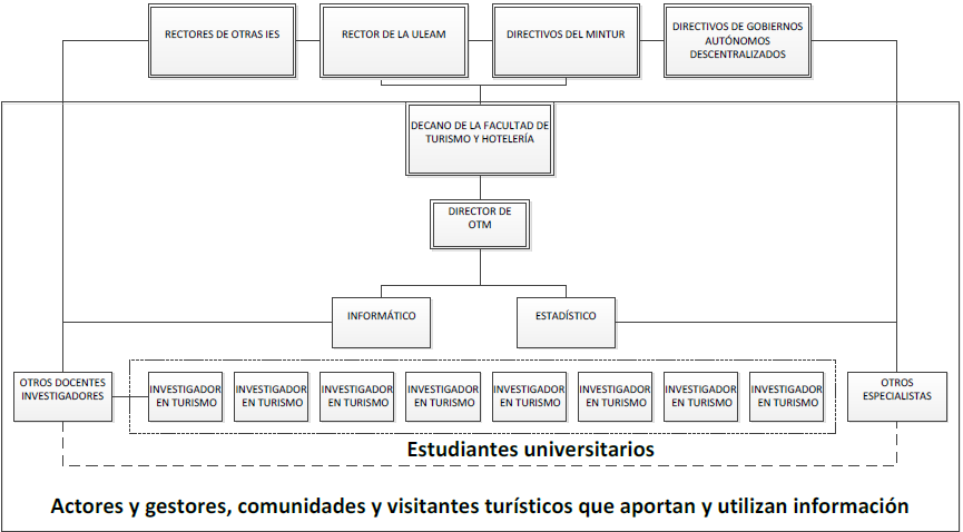 La figura 3 muestra el organigrama funcional del Observatorio Turístico de Manabí, en la parte superior se ubican aquellos encargados de representar los intereses institucionales y territoriales.