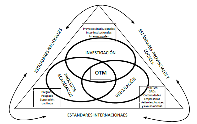 La interpretación de los criterios expresados, se modela en la figura 5, que muestra cómo utilizando la figura del Observatorio Turístico de Manabí se armonizan los procesos sustantivos de la universidad, lo que implica desde las aulas y según programas diseñados o rediseñados, generar y actualizar información en interacción con procesos de investigación. Los resultados que se gesten serán insumos para transformar la sociedad y contribuir a la solución de los problemas particulares de la gestión del turismo a nivel del territorio o la empresa.