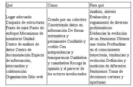 Un observatorio es una organización estructurada bajo determinado enfoque, que de forma sistemática, confiable y transparente, mediante generación e intercambio de información permite la realización de análisis, síntesis, comparación, evaluación, determinación de la evolución y tendencias de determinados procesos y fenómenos, generando nuevas fuentes de información para la toma de decisiones.