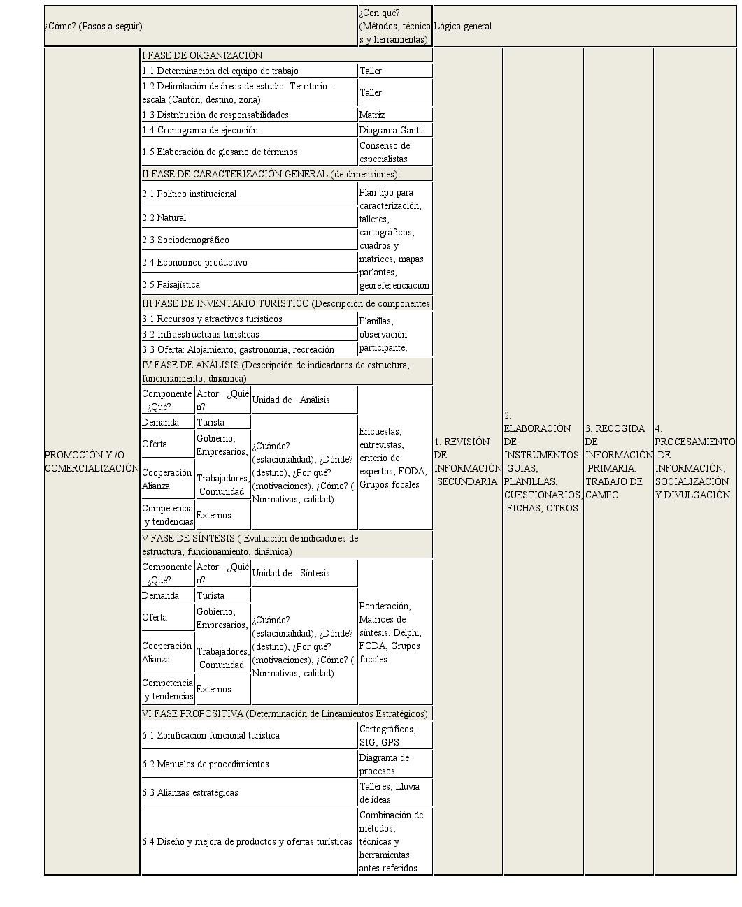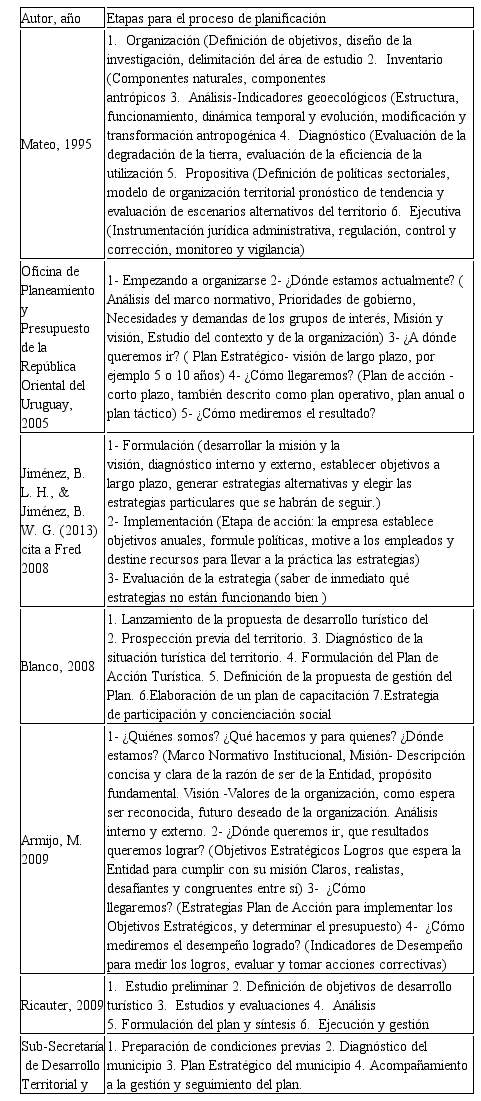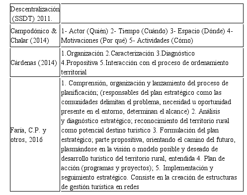Blanco (2008) propone una secuencia metodológica dirigida a reflejar la realidad local y permitir la promoción del turismo rural con el fin de elevar el nivel de vida de las comunidades rurales. Ricaurte (2009 a partir de la OMT, 1999) realiza una propuesta metodológica para el diagnóstico turístico local, aplicada a la República del Ecuador. El aporte de Campodónico & Chalar (2014) radica en evidenciar, unidades de análisis y componentes en una matriz científica del turismo, mediante interrogantes, que se detienen en los actores, gestores y consumidores de la actividad y el tratamiento de variables clave como tiempo, espacio, motivaciones y actividades. Cárdenas (2014) en base a Mateo, et al. (1991) plantea como ejecutar el proceso de ordenamiento territorial en Cuba (cuadro 2).
