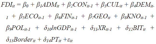 Where FDIit is the dependent variable for each individual . in each period t, β0 is the constant term, β1 to β9 are the coefficients of each distance dimension, δ10 to δ14 are the coefficients of each control variable, and εit is the random disturbance term, which, in the RE model, can be decomposed in εit = μi + νit, where the first term represents the individual random effects that don’t vary over time and the second term represents the unobserved variables. When regressing with a RE model, we used the transformation proposed by Baltagi and Chang (1994) since our panel is an unbalanced one.