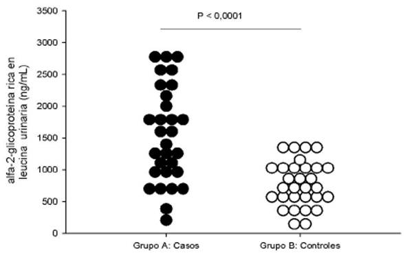 En la figura 1 se muestras las concentraciones urinarias de alfa-2-glicoproteína rica en leucina en cada uno de los grupos. Las concentraciones urinarias de A2GRL fueron significativamente más altas en el grupo A (1543,8 +/- 762,7 ng/mL) comparado con los valores promedios en los pacientes del grupo B (774,1 +/- 356,1 ng/mL; p < 0,0001).