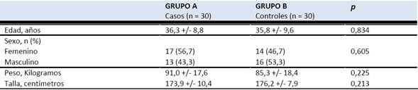 Se seleccionaron 60 pacientes para la investigación, de los cuales treinta pacientes con apendicitis (grupo A) y 30 pacientes considerados como controles (grupo B). Las características generales de los pacientes se muestran en la tabla 1. La edad de los pacientes en el grupo A fue de 36,3 +/- 8,8 años y en el grupo B de 35,8 +/- 9,6 años (p = 0,834). En el grupo A la mayoría de los pacientes eran de sexo masculino (16 pacientes, 53,3%) mientras que en el grupo B fueron la mayoría de sexo femenino (18 pacientes, 60,0%). Esta diferencia no fue significativa (p = 0,605). Tampoco se encontraron diferencias estadísticamente significativas en los valores promedio de peso y talla entre los dos grupos de estudio (p = 0,225 y 0,213, respectivamente).