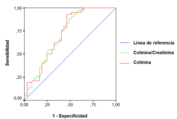 La curva COR (figura 1) presenta un área bajo la curva (ABC) igual a 0,729 con una significación asintótica < 0,001 e intervalos de 0,614 – 0,843 (95% de confianza) para la cotinina y 0,729 con una significación asintótica < 0,001 e intervalos de 0,616 – 0,843 (95% de confianza) para la cotinina/creatinina. En la tabla 2 se presentan los puntos de corte para cotinina y cotinina/creatinina con sus respectivos índices de Youden (IY).