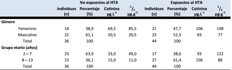 Un grupo de 80 niños fue clasificado como “expuestos o no al HTA” según el reporte de sus padres, en la distribución de la muestra (tabla 1) se observa predominio del género masculino y del grupo etario con edad ≤ 7 años, los valores de cotinina y el índice C /C resultaron mayores en este grupo etario y en el género femenino.