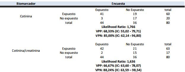 En la tabla 3 se presenta la relación de dependencia entre el resultado del biomarcador y la exposición real (Encuesta) de los individuos con un nivel de confianza de 95%, asimismo se evidencia los valores predictivos para cotinina y C/C con sus intervalos de confianza para el punto de corte seleccionado.