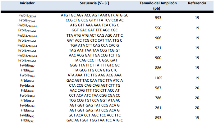 La detección de genes codificantes para TEM, SHV, CTX-M y las variantes CTX-M-1, -2, -8 y -9 se realizó utilizando los iniciadores y las condiciones de amplificación descritos previamente por Millán y col. (19). En el caso de las determinaciones que codifican para las metalo β-lactamasas (IMP, SPM y VIM) y K. pneumoniae-carbapenemasas (KPC) se utilizaron los iniciadores y las condiciones descritas previamente por Guevara y col. (20) y Labrador y Araque (15), respectivamente. En la tabla 1 se describen los iniciadores utilizados en este estudio. En todos los ensayos, los productos amplificados se separaron en geles de agarosa (Sigma-Aldrich) al 1%, teñido con bromuro de etidio (0, 5 µg/mL; Sigma-Aldrich) y fotografiados con el UVP Biodoc-It System. Se utilizó el marcador de peso molecular de 100 pb (Bioneer) para identificar el tamaño de los productos amplificados.