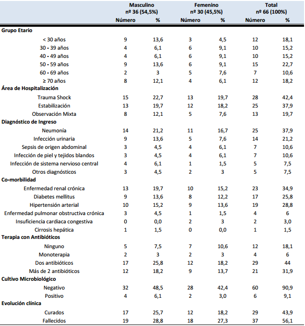 En la tabla 2 se resumen las características clínicas y epidemiológicas de los pacientes estudiados. Los 66 pacientes adultos se distribuyeron de la siguiente manera: femeninos 30 (45, 5%) y 36 masculinos (54, 5%). La edad promedio fue de 50, 9 años (d= 20, 1) en un rango que abarcó de 17 a 93 años. El 42, 4% de los pacientes con sepsis fueron hospitalizados en trauma shock, seguidos por los asignados al área de estabilización con 37, 9% y el resto con un 19, 7% en observación mixta. No se observaron diferencias notables en cuanto a la distribución de los pacientes femeninos y masculinos en las distintas áreas de hospitalización. De acuerdo al diagnóstico clínico principal se reconocieron diversos puntos de partida para la sepsis, siendo el tracto respiratorio (neumonías) el más frecuente (37, 9%; 25/66), seguidas por la infección del tracto urinario (21, 2%; 14/66), evidenciándose en ambos un predominio en el sexo masculino. El tercer lugar fue ocupado por la sepsis de origen abdominal y la infección de piel y tejidos blandos (10, 6% c/u; 7/66). Todos los pacientes presentaron por lo menos una comorbilidad subyacente, siendo las condiciones coexistentes más frecuentes: la enfermedad renal crónica (34, 9%; 23/66), hipertensión arterial (28, 8%; 19/66) y diabetes mellitus (25, 8%; 17/66).