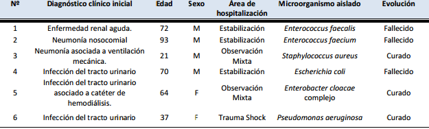 El diagnóstico clínico y microbiológico de los casos con hemocultivos positivos se muestra en la Tabla 3. Se identificaron 6 microorganismos diferentes (3 Gram positivos y 3 Gram negativos) en 6 pacientes con shock séptico que se ubicaron principalmente en el área de estabilización. Las especies bacterianas identificadas fueron: Enterococcus faecalis, Enterococcus faecium, Staphylococcus aureus, Escherichia coli, complejo Enterobacter cloacae y Pseudomonas aeruginosa. Estas cepas fueron aisladas principalmente en pacientes cuya infección tuvo como punto de partida el tracto urinario (4/6). Tres de los 6 pacientes con mayor edad no sobrevivieron a la infección.