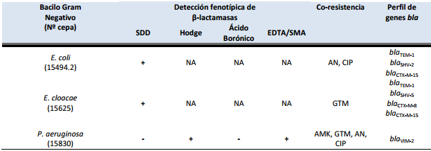 En la Tabla 6 se describen las características fenotípicas y genéticas de las cepas Gram negativas resistentes a los β-lactámicos. Las cepas de E. coli y E. cloacae demostraron la producción de BLEE mediante la prueba SDD, mientras que la carbapenemasa fue detectada en P. aeruginosa a través del ensayo de Hodge, la cual fue definida como una metalo-β- lactamasa utilizando el disco EDTA-SMA. La caracterización molecular de las dos enterobacterias permitió demostrar un patrón complejo de producción de β-lactamasas, representado por 3 tipos diferentes de BLEEs (TEM, SHV y CTX-M). El análisis de la secuenciación de los genes blaBLEEs en E. coli confirmó la presencia de blaTEM-1, blaSHV-2 y blaCTX-M-15, mientras que en la cepa complejo E. cloacae se identificaron 4 variantes: blaTEM-1, blaSHV-5, blaCTX-M-8 y blaCTX-M-15. En P. aeruginosa se logró detectar una metalo-enzima del grupo VIM cuya variante genética fue determinada por el análisis de la secuencia como blaVIM-2. Todas estas cepas productoras de β-lactamasas presentaron resistencia asociada, por lo menos, a un representante de las fluoroquinolonas y/o aminoglucósidos.