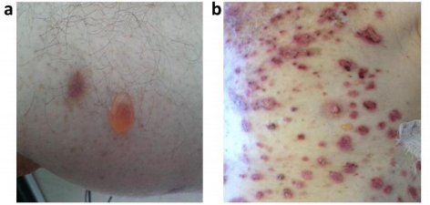 El PA es una enfermedad ampollosa autoinmune de la que desconoce asociación con algún gen HLA. Las lesiones son vesículas tensas, grandes, en extremidades (cara interna de muslos y áreas de flexión de brazos y piernas), zona inguinal, axilas, abdomen y cuello (2). Puede presentar erupción prodrómica pre-ampollosa con máculas eritematosas, pápulas, placas urticariformes y lesiones eccematosas. Estas vesículas permanecen intactas, no se deforman bajo presión y su ruptura produce erosiones que evolucionan a costras.