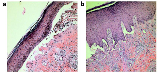 2a. Formación de vesículas sub-epidérmicas e infiltrado inflamatorio en la cavidad de la ampolla. Coloración de hematoxilina-eosina 10x. 2b. Infiltrado rico en eosinófilos en la dermis. Coloración de hematoxilina-eosina 20x