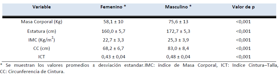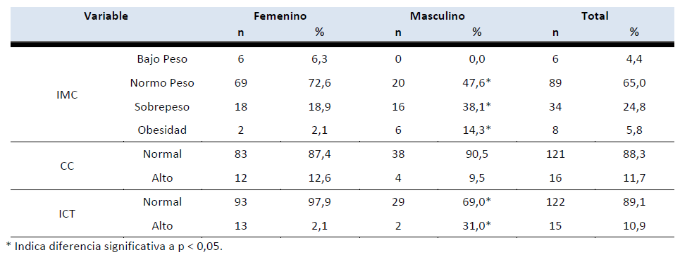 Antropometría y Marcadores Cardiometabólicos. En la Tabla 1 se muestra las variables antropométricas de los estudiantes universitarios evaluados en la que se puede observar que los hombres fueron, significativamente más pesados, más altos y con mayor IMC, CC e ICT.