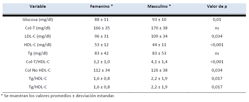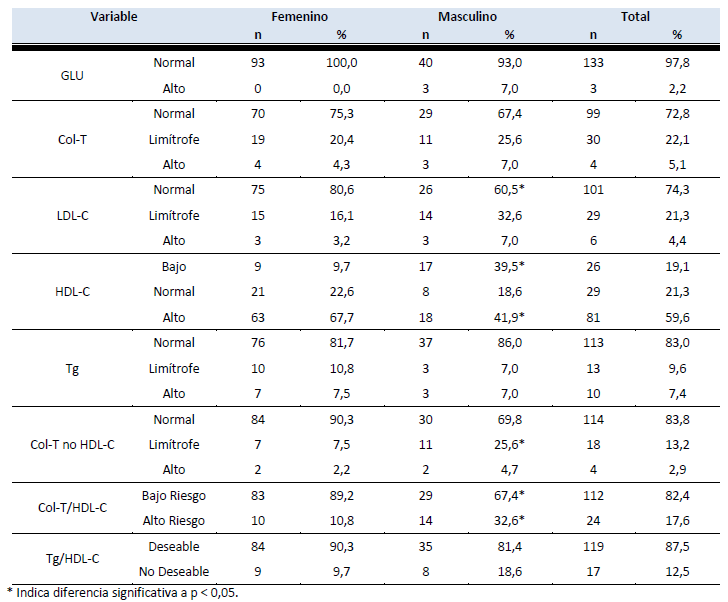 Para categorizar como alta la concentración de glucosa en suero se utilizó el valor de ≥ 110 mg/dl (24); para los diferentes componentes del perfil lipídico, incluido el no HDL-C, se utilizaron los puntos de corte propuestos por el Panel de expertos en salud cardiovascular y reducción del riesgo en niños y adolescentes del Instituto Nacional de Salud de los Estados Unidos (25); mientras que para el índice Col- T/HDL-C el punto de corte sugerido por Castelli y Col.(26) y para el índice Tg/HDL-C se catalogó como valores deseable aquellos menores a tres.