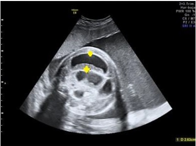 At 35+4 weeks the patient was admitted because of contractions and the baby was delivered by a caesarean section. This helped maintain fetal wellbeing and was deemed less risky compared to a vaginal delivery. The baby girl was born with a weight of 2.06kg, had an Apgar score of 9 and the pH of the umbilical artery 7.23. Initial respiration started spontaneously, but assistance with intermittent positive pressure ventilation (IPPV) with an inspired oxygen fraction (Fi02) of 30% was required. This had to be increased to 40% due to the compression of the thorax from abdominal distension. The neonate was taken into the neonatal intensive care unit.