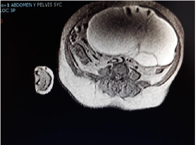 El informe de la RM abdominopélvica con gadolinio iv (cortes axiales Spin Echo-SE potenciados en T1 y Fast Spin Echo potenciados en T2 sin gadolinio y cortes axiales SE potenciados en T1 con gadolinio) revela una voluminosa imagen quística multitabicada con nódulos murales, que ocupa casi la práctica totalidad del hemiabdomen izquierdo llegando a pelvis menor (fig. 1 y 2). No se aprecia realce de la lesión tras la inyección de contraste ni tampoco imagen clara de núcleo sólido. La lesión es sugestiva de cistoadenocarcinoma de ovario izquierdo. Se aprecia contenido hematometra en cavidad uterina.