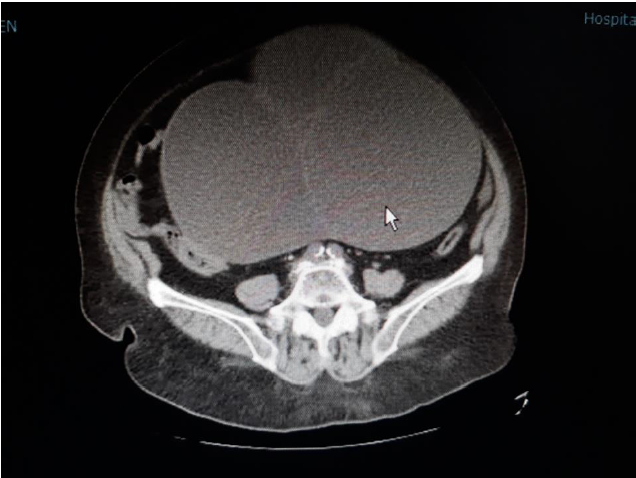 Se solicita de urgencia preoperatorio con hallazgo de leucocitosis leve sin neutrofilia y estudio de coagulación normal. En la TC de abdomen sin contraste iv (fig. 3) solicitada se aprecia una gran masa abdominopélvica que mide 26*19*16 cm (axial, longitudinal y anteroposterior), predominantemente quística, con septos en su interior, su polo inferior se encuentra orientado hacia hemipelvis derecha donde no es posible descartar dada la ausencia de contraste de la prueba que pueda tener un componente sólido. Ambos anejos se encuentran desplazados hacia la derecha e impresionan estar en contacto entre ellos sugiriendo torsión anexial. Hematometra. Mínima cantidad de líquido libre en la gotiera paracólica izquierda. No se objetivan otros hallazgos de interés.