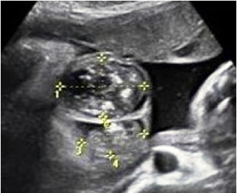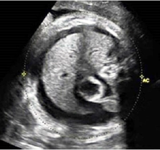 Se trata de paciente de 20 años, 2 gestas, 1 para, quien consultó a las 36 semanas debido a que durante la evaluación ecográfica rutinaria se detectó polihidramnios, ascitis fetal y zonas hiperecogénicas peri-intestinales de distribución periférica, perivisceral y entre asas intestinales, sin derrame pericárdico ni pleural (figura 1). También se observó hidrocele bilateral con contenido hiperecogénico y calcificaciones en su interior, conducto inguinal permeable y sin flujo por el estudio de Doppler color compatible (figura 2). La paciente refería un embarazo controlado. La serología materna para hepatitis B y C, virus de inmunodeficiencia humana, sífilis, toxoplasma y citomegalovirus fueron negativas. Negaba enfermedades infecciosas durante el embarazo o uso de fármacos diferentes a las vitaminas prenatales. Los estudios ecográficos a la semana 15 y 28 mostraban feto masculino único con morfología fetal y líquido amniótico normal. En vista de los hallazgos se decide inducir el parto.