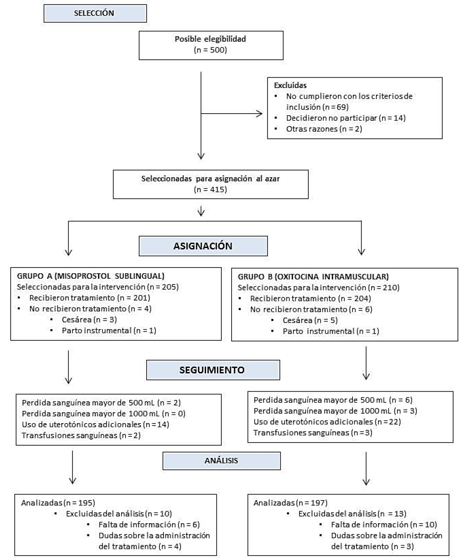 Posterior a la asignación a cada grupo de tratamiento y a la obtención del recién nacido, a las pacientes del grupo A se les administró 600 mcg (3 tabletas) de misoprostol sublingual. En forma similar, en el grupo B a las pacientes seleccionadas se les administró 20 UI de oxitocina intramuscular. Si se utilizaba una infusión de oxitocina durante el trabajo de parto, se detuvo su uso al final de la segunda etapa del parto. El manejo activo de la tercera etapa del parto se realizó de forma activa. Todos los casos fueron atendidos por médicos independientes a la investigación y siguiendo las normas habituales de la atención de las pacientes obstétricas. Ninguno de los investigadores participó en la atención de las pacientes. Luego del parto se procedió al clampeo del cordón un minuto después del nacimiento, masaje suave del útero y extracción de la placenta por tracción controlada del cordón. Si la placenta no se desprendía luego de 30 minutos, se procedió a removerla manualmente.