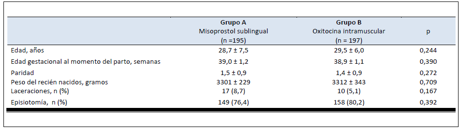 Se seleccionaron un total de 500 embarazadas las cuales se asignaron al azar para recibir misoprostol sublingual (grupo A) u oxitocina intramuscular (grupoB) durante el periodo de estudio. Los datos clínicos y de laboratorio completos se obtuvieron de 392 pacientes (195 en el grupo A y 197 en el grupo B) las cuales fueron incluidas para el análisis final (figura 1). No se encontraron diferencias significativas entre los grupos con respecto a edad de las pacientes, edad gestacional al momento del parto, paridad, peso del recién nacido al nacer, frecuencia de laceraciones y episiotomía (p = ns; tabla 1).