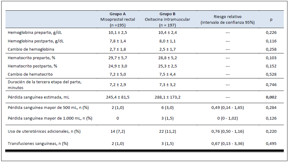Análisis estadísticos. Los datos se presentan como medidas absolutas y relativas. Los resultados se muestran en tablas. Las concentraciones de hemoglobina y hematocrito pre y postparto, duración de la tercera etapa del parto, pérdida hemática estimada, pérdida sanguínea mayor de 500 mL y 1000 mL, necesidad de usos de uterotónicos, uso de transfusiones y efectos adversos se analizaron con la prueba t de Student para muestras no relacionadas en aquellas variables cuantitativas y la prueba chi cuadrado para aquellas variables cualitativas. Se utilizó la prueba exacta de Fischer para calcular el riesgo relativo (RR) y el intervalo de confianza del 95% (IC 95%) para cada una de las variables cualitativas de las resultantes estudiadas. Se fijó la significancia estadística en p < 0,05.