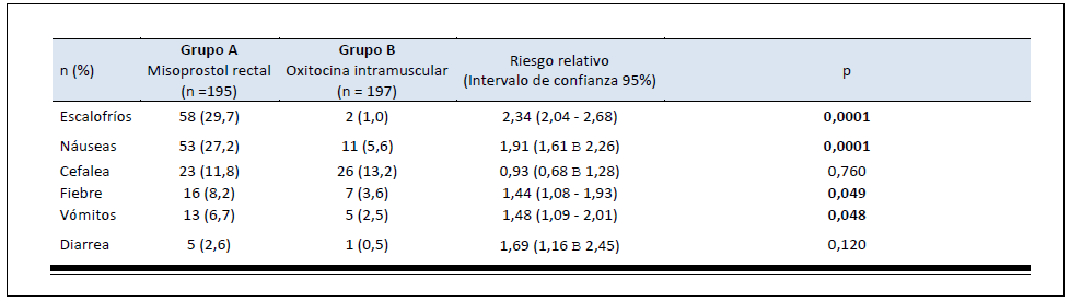 Las pacientes de ambos grupos de tratamiento presentaron una incidencia de cefalea y diarrea similar (p = ns; tabla 3). Las pacientes tratadas con misoprostol sublingual presentaron una mayorfrecuencia de escalofríos (29,7% en el grupo A comparado con 13,2% en el grupo B; riesgo relativo 2,34; IC 95%, 2,04 – 2,68), náuseas (27,2% parar el grupo A comparado con 5,6% para el grupo B, riesgo relativo 1,91; IC 95%, 1,61 – 2,26), fiebre (8,2% en el grupo A comparado con 3,6% en el grupo B; riesgo relativo 1,44; IC 95%, 1,08 – 1,93) y vómitos (6,7% en el grupo A comparado con 2,5% en el grupo B; riesgo relativo 1,48; IC 95%, 1,09 – 2,01) que las pacientes del grupo tratadas con oxitocina intramuscular.