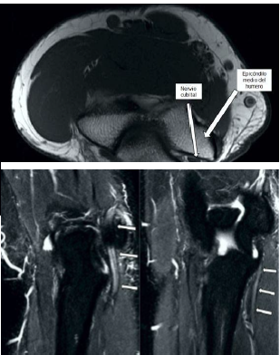 No obstante, las pruebas neurofisiológicas no proporcionan información anatómica o morfológica sobre el túnel cubital o el nervio cubital. El músculo ancóneo epitroclear puede identificarse por ultrasonido de alta resolución o en imágenes de resonancia magnética, las cuales son modalidades confiables para mostrar anomalías estructurales e identifican la causa de la neuropatía cubital, así como las variantes anatómicas. La ecografía puede distinguir nervios de músculos y tendones por su textura diferente y su relativa movilidad durante las maniobras de flexión-extensión (11). En la resonancia magnética el músculo ancóneo epitroclear es visible en cortes axiales, donde las relaciones con el nervio cubital y estructuras vecinas están mejor delimitadas. El edema en este músculo se puede detectar en imágenes ponderadas en T1(12).