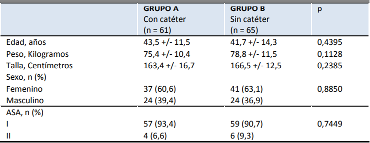 Se seleccionaron un total de 140 pacientes de los cuales 70 fueron asignados para ser tratados con catéter (grupo A) y 70 pacientes para ser tratados con catéter (grupo B). Se excluyeron 9 pacientes en el grupo A debido a que 5 se sacaron accidentalmente el catéter y 4 pacientes se negaron a suministrar datos para el estudio. En el grupo B se excluyeron 5 pacientes por no tener datos completos durante el seguimiento. Por lo tanto se utilizaron los datos de 61 pacientes en el grupo A y 65 pacientes en el grupo B, cuyas características se muestran en la tabla 1. No se encontraron diferencias estadísticamente significativas con relación a la edad, peso y talla (p = ns). Tampoco se encontraron diferencias en la distribución por sexo y clasificación ASA entre los grupos (p = ns).