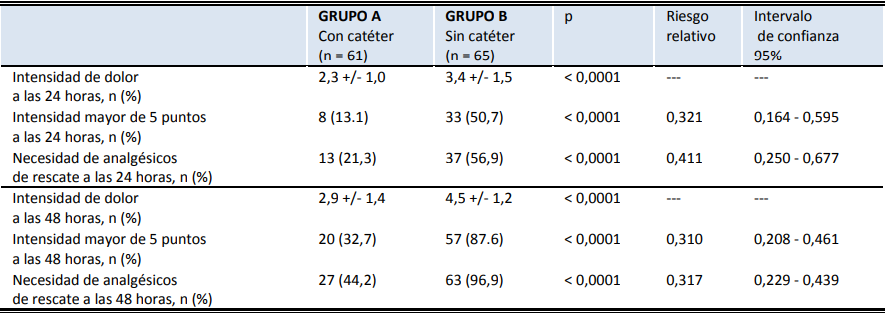 A las 48 horas, la intensidad del dolor en los pacientes del grupo A continua siendo significativamente más baja comparado con los pacientes del grupo B (2,9 +/ 1,4 puntos comparado con 4,5 +/ 1,2 puntos; p < 0,0001). Solo 20 pacientes (33,3%) en el grupo A presentaron dolor por encima de los 5 puntos a las 48 horas comparados con 57 pacientes (90,0%) del grupo B (p < 0,05), representando un riesgo relativo de 0,310 (intervalo de confianza 95%, 0,208 – 0,461). En el grupo B, 63 pacientes (96,9%) necesitaron analgesia de rescate a las 48 horas comparado con 27 pacientes (44,2%) en el grupo A con un riesgo relativo de 0,317 (intervalo de confianza 95%, 0,229 – 0,439; p < 0,0001).