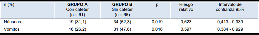 Entre los efectos adversos (tabla 3), se observó que las náuseas y los vómitos fueron los únicos efectos adversos observados. En el grupo A, 19 pacientes (31,1%) presentaron náuseas y 16 pacientes (26,2%) presentaron vómitos durante el periodo de 48 horas. En el grupo B, 34 pacientes (52,3%) presentaron náuseas y 31 pacientes (47,6%) presentaron vómitos. Esta diferencia se consideró estadísticamente significativa (p = 0,019 y 0,016, respectivamente). El riesgo relativo para náuseas y vómitos fue de 0,623 (intervalo de confianza 95%, 0,413 – 0,939; p < 0,0001) y 0,597 (intervalo de confianza 95%, 0,384 – 0,929; p < 0,0001). Cuarenta y siete pacientes (77,0%) del grupo A y 31 pacientes en el grupo B (47,6%) indicaron que utilizarían el tratamiento si necesitaran otra cirugía (tabla 4; p = 0,0013)