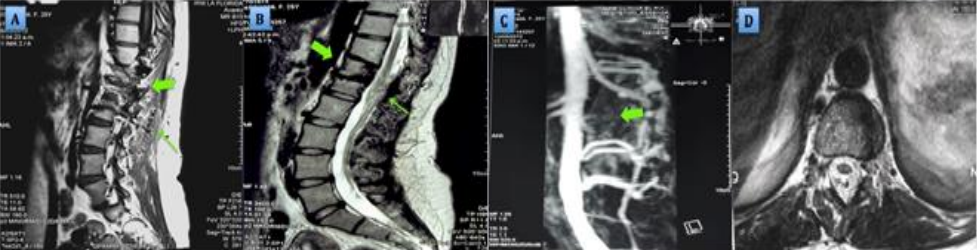 Paciente femenino de 32 años, natural y procedente de Maracay, estado Aragua, con antecedentes de cesárea en el año 2003 la cual complicó con hemorragia moderada durante la anestesia peridural. Posteriormente, comienza a presentar dolor lumbar crónico y dificultad para la deambulación. Estudios de imágenes demostraron escoliosis, colapso del cuerpo vertebral L1 y MAV lumbar. Arteriografías realizadas en otro centro en el año 2006 fueron interpretadas como malformaciones arterio-venosas extradurales toracolumbares bilaterales desde el nivel T11 hasta el L2 (Figura 1B y 1C). A raíz de esta sintomatología se le practicó embolización endovascular en el mismo año, reportando obliteración de un 40% del nido malformativo. La mejoría clínica de la paciente fue limitada, ya que a los 3 meses comienza nuevamente con los síntomas. Para el año 2008, había progresado hasta presentar paraplejía espástica (3/4), hipertonicidad bilateral y trastornos esfinterianos severos. En los años siguientes se le realiza varios estudios de resonancia magnética (RMN), tomografía (TAC) y arteriografía que reportan presencia de las lesiones malformativas arterio-venosas identificadas desde el inicio de sus síntomas.