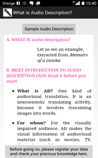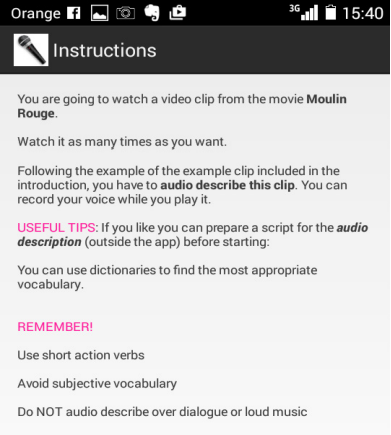 La figura 2 también muestra como se puede acceder a un cuestionario (pre-test), en el que el usuario puede completar sus datos personales, además de autoevaluar sus conocimientos sobre la AD y sobre la lengua inglesa en general. Además, se pide al usuario traducir palabras que luego podrían ser útiles a la hora de realizar la tarea de la AD. Esto se sustenta en la teoría del andamiaje del aprendizaje, promovida por autores como Kukulska-Hulme (2015: 11-13) en el caso específico de implementación pedagógica de tareas en el área de MALL. La pantalla siguiente ilustra las instrucciones, en la que el usuario puede leer información adicional sobre cómo audio-describir (según se han mencionado anteriormente como aspectos a tener en cuenta en la tarea de la AD: