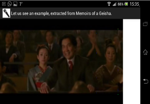 Esta misma pantalla incluye dos botones opcionales: el primero, en la parte superior de la pantalla, dirige al usuario a una muestra de cinco segundos de una AD, extraída de la película Memoirs of a Geisha, que sirve a la vez como una actividad de comprensión auditiva a modo de preparación para la tarea en sí: