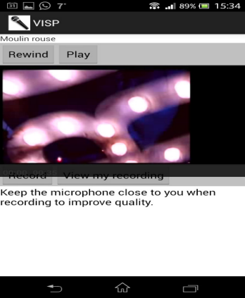 En primer lugar, adaptar el material pedagógico y/o audiovisual, en varios niveles: 1) en tiempo; es decir, incluir material audiovisual de muy corta duración. Para esta primera versión elegimos un clip de 30 segundos de la película Moulin Rouge (2001). Siguiendo con las convenciones de la AD (Benecke, 2004; Matamala y Orero, 2007), un audiodescriptor puede tomar entre 160 y 180 por minuto. En VISP, sin embargo, el usuario podrá emplear un máximo de 60 palabras. Además, 2) en cuanto a contenidos, el fragmento fue seleccionado teniendo en cuenta el tipo de vocabulario que los usuarios deberían ser capaces de usar. Finalmente, 3) el fragmento también fue seleccionado por el grado de dificultad que entraña a la hora de audiodescribir, que en este caso corresponde a un nivel intermedio del MCERL. Así, por ejemplo, este fragmento no contiene ningún tipo diálogo y hay poca acción, lo que permite que el usuario tenga más tiempo para describir lo que está viendo y pueda grabar su voz mientras visiona el clip sin necesidad de acudir a ninguna herramienta complementaria.