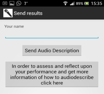 Es en este punto cuando el usuario puede enviar voluntariamente sus resultados, que llegan en formato mp3 a una cuenta de correo destinada para tal fin. Además se puede completar un cuestionario final (post-test) y ver el mismo clip con AD original. Este cuestionario final ha sido concebido para reforzar la fase de reflexión de toda tarea comunicativa, al comparar sus resultados con el guión audiodescrito (GAD) original. En este encontrará una serie de preguntas que le invitan a la reflexión sobre sus resultados y sobre la tarea de audiodescribir en sí, lo que pretende acercar al usuario al mundo de la AD y promover su competencia intercultural mientras asume el rol de audiodescriptor por unos minutos. A pesar de los errores típicos que comete una persona al realizar una AD por primera vez, como son describir sonidos fácilmente reconocibles (ya se escuchan no hay que describirlos) o usar vocabulario subjetivo (lo que hace que se interpreta en vez de describir), gracias a tareas como estas la AD se convierte en una excelente herramienta comunicativa que hace que el aprendiz se tenga que poner en el lugar del otro, en este caso de la persona con discapacidad visual para la cual describe algo, y por tanto desarrolle su competencia intercultural (Vermeulen e Ibáñez Moreno, en prensa).