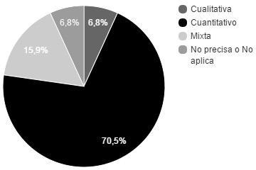 En cuanto a las metodologías aplicadas, destacan las cuantitativas, con 31 publicaciones, mientras que solo tres aplicaron una metodología cualitativa. Siete investigaciones fueron elaboradas a partir de una metodología mixta (cualitativa y cuantitativa). Llama la atención también que algunas de las publicaciones no señalen de forma explícita el tipo de metodología aplicada.