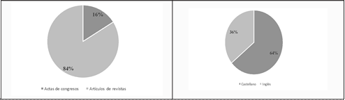 En cuanto a la lengua, 32 del total de publicaciones fueron publicadas en castellano y 18 en inglés. Con excepción de una sola comunicación, el resto de comunicaciones fueron publicadas en inglés, lo que confirma la tendencia internacional del uso de este idioma como lingua franca de la comunicación científica.