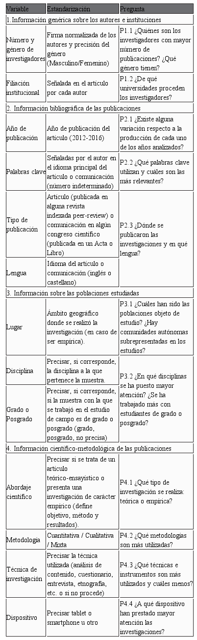 Con el propósito de establecer un análisis sistematizado se utilizaron las siguientes variables para el análisis, las mismas que fueron estandarizadas y permitieron la formulación de preguntas de investigación, organizadas en 4 categorías: