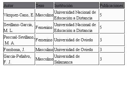 Es importante señalar que los primeros cuatro autores con mayor producción son parte de un proyecto de investigación común, denominado “Aprendizaje ubicuo con dispositivos móviles: elaboración y desarrollo de un mapa de competencias en educación superior” y financiado por el Ministerio de Ciencia e Innovación de España. Asimismo, han realizado otras investigaciones en áreas de interés vinculadas.