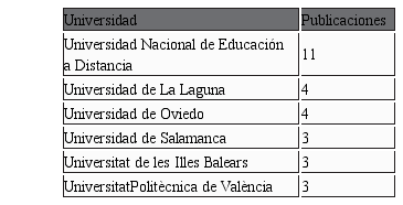 Las universidades afiliadas a los autores de las publicaciones analizadas suman 40, de ellas 35 son españolas y cinco extranjeras. En cuanto a las que tienen mayor número de publicaciones están la Universidad Nacional de Educación a Distancia, con 11 publicaciones; seguida de las universidades de La Laguna y Oviedo, con cuatro cada una; y las de Salamanca, Islas Baleares, y Politécnica de Valencia, con tres.