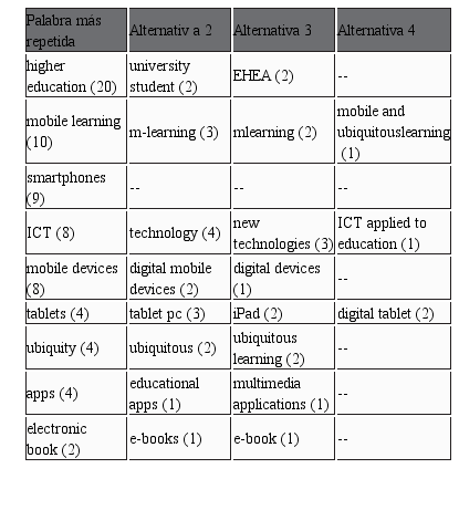 En total, se identificaron 131 palabras clave. Las más repetidas fueron higher education (20 menciones), mobile learning (10 menciones), smartphones (nueve menciones), ICT (ocho repeticiones) y mobile devices (ocho menciones). En la siguiente tabla se observa la dispersión de palabras clave, lo que genera dificultad para encontrarlas en las bases de datos, y el uso de palabras clave no normalizadas que corresponden al mismo ámbito (e.g. “mlearning” en lugar de “m-learning”; el uso indistinto de formas singulares o plurales e.g. “tablet” y “tablets”; o de modelos específicos e.g. “iPad” en vez del nombre del dispositivo “tablet”). En muchas publicaciones no se exige el uso de un tesauro o lista de palabras clave, por lo que cada autor optar por colocar las que considera pertinentes.