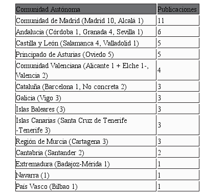 Los resultados indican que, efectivamente, hay comunidades autónomas subrepresentadas en los estudios. Destaca la representación mayoritaria de la Comunidad de Madrid, encabezado por Madrid capital, junto con las de Andalucía y Castilla-León. Sorprende que algunas comunidades con demografía importante y con una amplia red de universidades estén poco presentes como objeto de estudio (en particular, los casos de Cataluña y País Vasco).