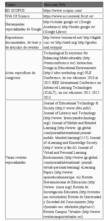 En vista de que la mayoría de sitios mencionados en la Tabla 1 publican sus contenidos en idioma inglés, se utilizaron los términos de búsqueda tanto en español como en inglés con sus respectivos acrónimos y combinaciones, entre los cuales se puede mencionar: entornos personales de aprendizaje, personal learning environments, PLE, entornos personales de aprendizaje móvil, mobile personal learning environment, mPLE combinados con los términos educación superior, educación universitaria, higher education, university education, respectivamente.