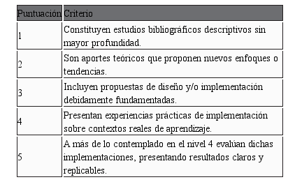 En otros estudios, se busca mejorar los actuales MOOC (Massive Open Online Course) desde un enfoque conectivista (cMOOC) (Fidalgo-Blanco, Sein-Echaluce y García-Peñalvo, 2015; Adell y Castañeda, 2013), donde el proceso de adquisición del conocimiento si bien responde a un trabajo autónomo, motivado y autorregulado, pero que se nutre de la participación y colaboración en red. Las investigaciones de este grupo se presentan en la tabla 5.