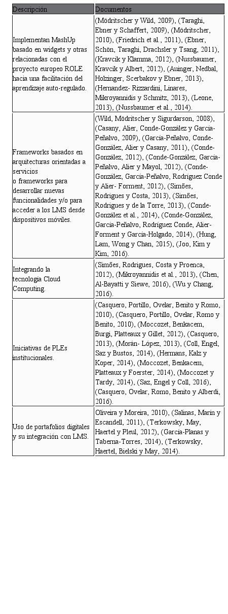 En cuanto al enfoque adoptado para implementar los PLE o mPLE en las universidades, se observó dos corrientes conceptuales en los trabajos revisados: una más técnica (Casquero, Portillo, Ovelar, Benito y Romo, 2010; Conde- González, 2012; Türker y Zingel, 2008; van Harmelen, 2006; Wilson et al., 2006) y otra pedagógica (Adell y Castañeda, 2010; Cabero-Almenara y Vázquez-Martínez, 2013). Dentro de la primera corriente, se describen las propuestas orientadas al desarrollo de nuevas plataformas institucionales, desde donde los estudiantes diseñan sus PLE y aquellos proyectos que mejoran las infraestructuras existentes en las universidades, dotándoles de capacidades de personalización con el objetivo de superar los limitantes de los actuales LMS (Johnson et al., 2006; Ebner, Schön, Taraghil, Drachsler y Tsang, 2011; Dabbagh y Kitsantas, 2012; Conde-González, 2012; Tomberg et al., 2013). La mayoría de estas implementaciones se basan en el uso de widgets . mashUps de widgets, en arquitecturas orientadas a servicios y en tecnologías centradas en la nube (cloud computing).