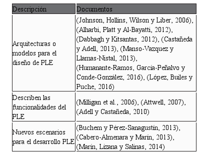 En otros trabajos, se destaca la construcción de los PLEs a partir de las infraestructuras institucionales, como los PLEs potenciados institucionalmente (iPLE), el habilitador PLE institucional (iPLEe), el PLE híbrido institucional (HIPLE), por mencionar algunos. Las investigaciones de este grupo se presentan en la tabla 4.