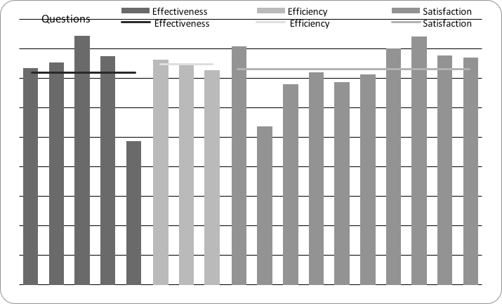 As we mentioned before, we evaluated the usability using questionnaires based on ISO 9241-11, which provides usability guidelines (effectiveness, efficiency and satisfaction). Responses average were very similar, ranged from 3.59 to 3.73, out of 5 (see Figure 9).