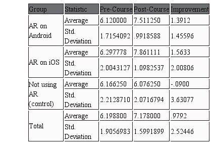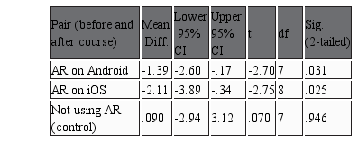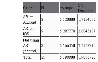 Finally, comparing the results of the two experimental groups using AR (iOS and Android), we can observe a statistical significance of 0.503 which supports that both groups are not significantly different regarding the improvement of their grades.