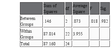 The null hypothesis that the grades of the members of the different groups overlap (that is, there is no significant difference) was tested using Analysis of Variance (ANOVA). The analysis of the qualifications before the beginning of the course among the three groups showed no significant difference (Table 2) between the groups in terms of their qualifications before conducting the training (F2,22 = 0.018, p = 0.982).