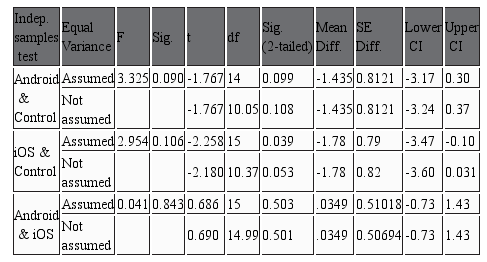 The results (Table 4) showed that the experimental groups (Android and iOS) had significant differences between the average grades before and after the course (sig.<0.05), and therefore the null hypothesis was rejected for these groups. However,the grades did not change significantly for the control group, and therefore in thiscase the null hypothesis was accepted.